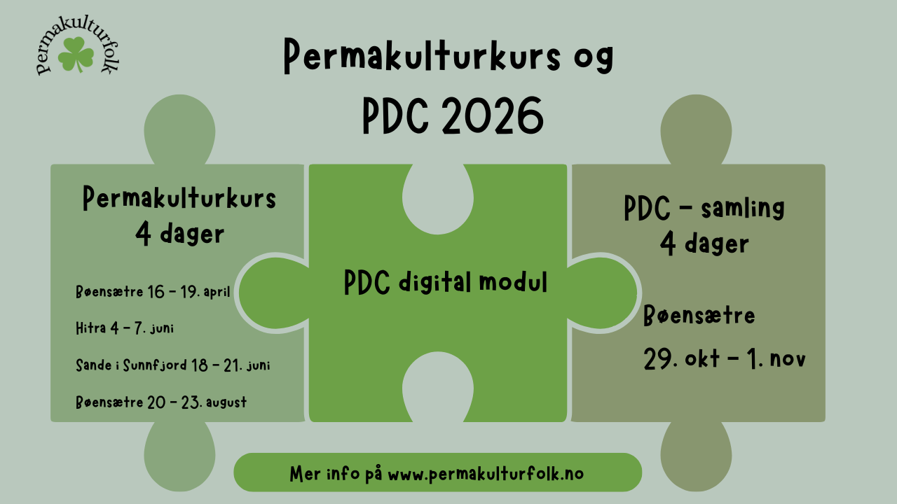Hos oss kan du bygge pĂĄ helgekurset med en digital del i september/ oktober og en samling sen høst for ĂĄ fĂĄ den intermasjonalt anerkjente sertifiseringen Permaculture Design Certificate (PDC)Â