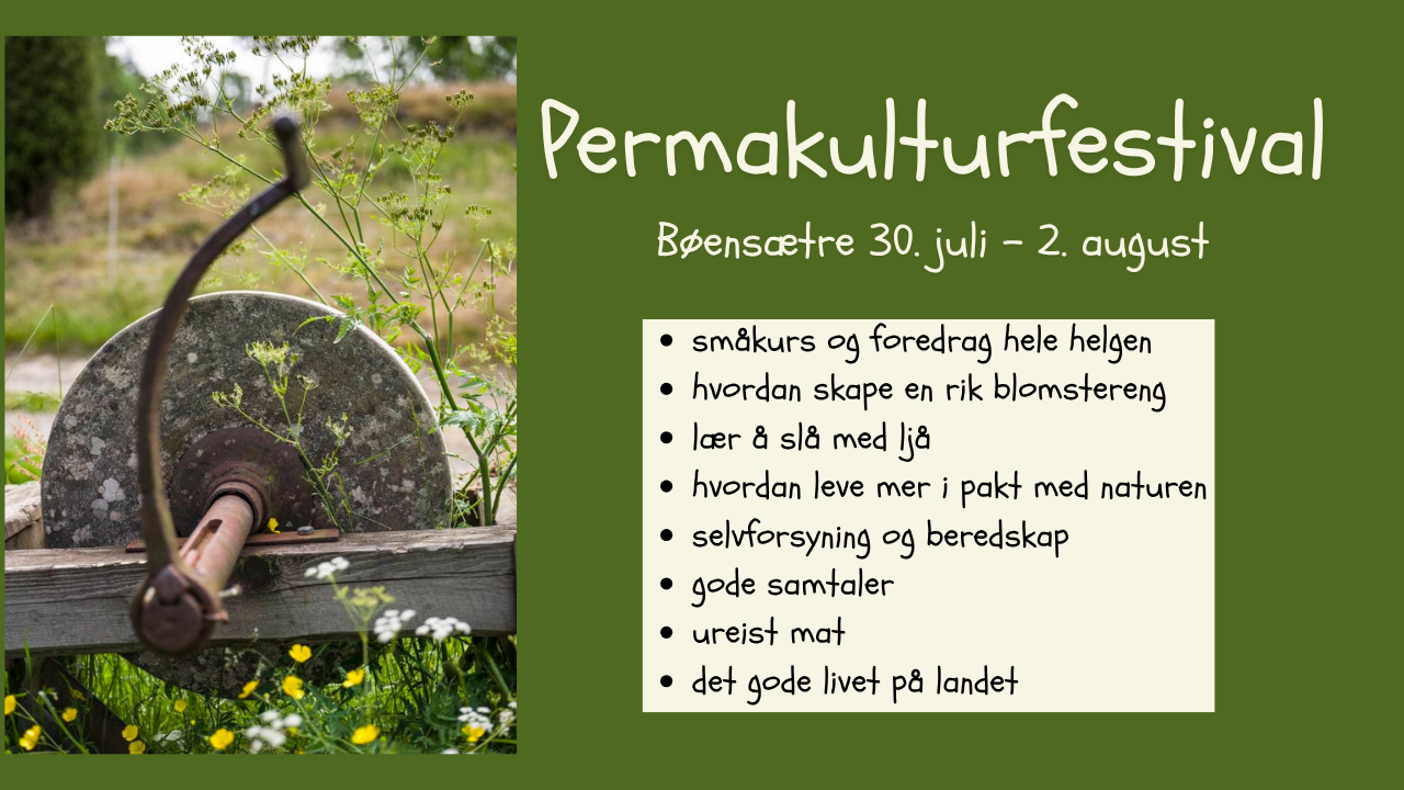 Gjennom festivalen utforsker vi hvordan husmannskulturens nøkternhet, kunnskap og respekt for ressursene kan forenes med nytenkende permakultur. Gamle driftsformer møter moderne løsninger, og tradisjon blir et fundament for framtidig selvforsyning, beredskap og levende kulturlandskap.